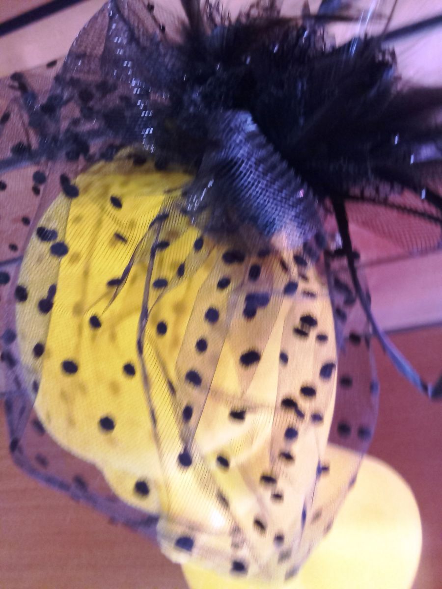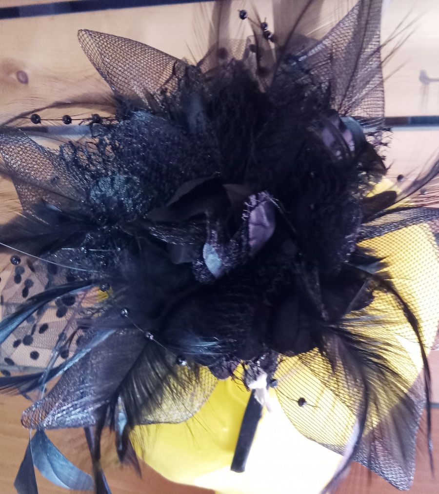 Στέκα-καπελάκι με βέλο διακοσμημένο με οργάντζα,φτερά και χάντρες.Διαθέτει πιαστράκι και μπορεί να φορεθεί ανεξάρτητα η’ με τη στέκα.