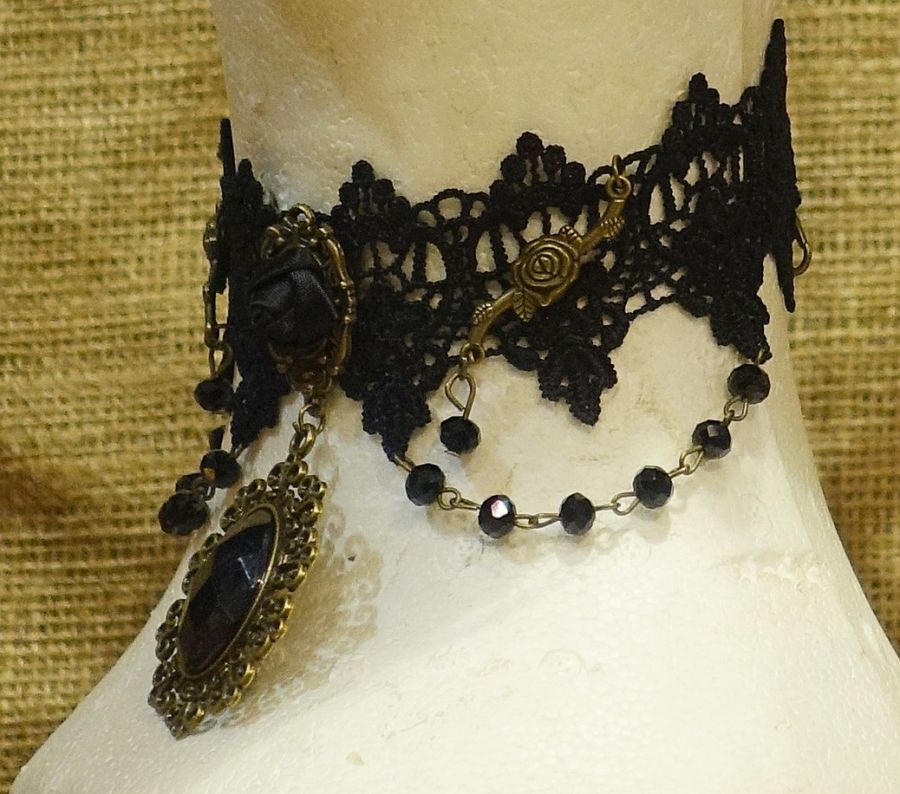 GothicChoker….Πλεκτό Με Πολυεστερικό Νήμα ….Διακοσμημένο Με Ακρυλικά Πετράδια Και Αλυσιδάκι……Έξτρα Αλυσίδα Στο Κούμπωμα Ώστε Να Βολεύει Σε Όλους….Σετάρεται Με Βραχιόλι Και Σκουλαρίκι Στο Ίδιο Ύφος…
