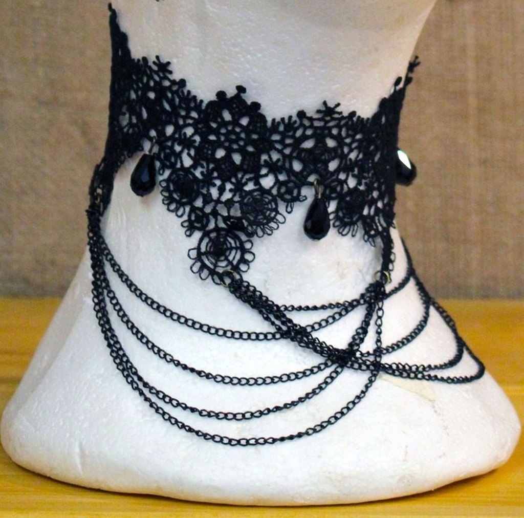 Gothic Choker ….Πλεκτό Με Πολυεστερικό Νήμα ….Διακοσμημένο Με Ακρυλικά Πετράδια Και Αλυσιδάκι……Έξτρα Αλυσίδα Στο Κούμπωμα Ώστε Να Βολεύει Σε Όλους….Σετάρεται Με Βραχιόλι Και Σκουλαρίκι Στο Ίδιο Ύφος…